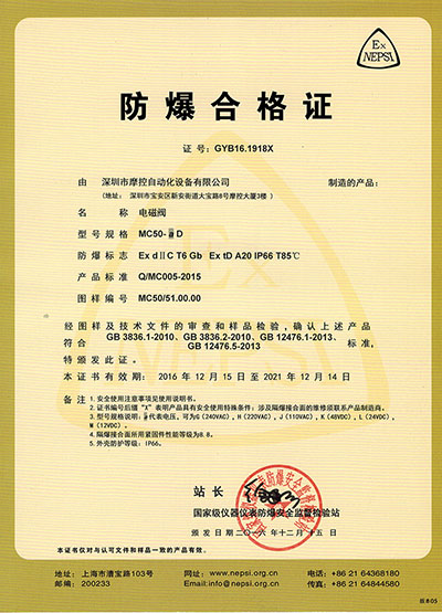 MC50系列電磁閥獲得由國家級儀器儀表防爆安全監督檢驗站(NEPSI)頒發的ExDⅡCT6 Gb, DIP A20 TA,T6 and IP66認證證書。